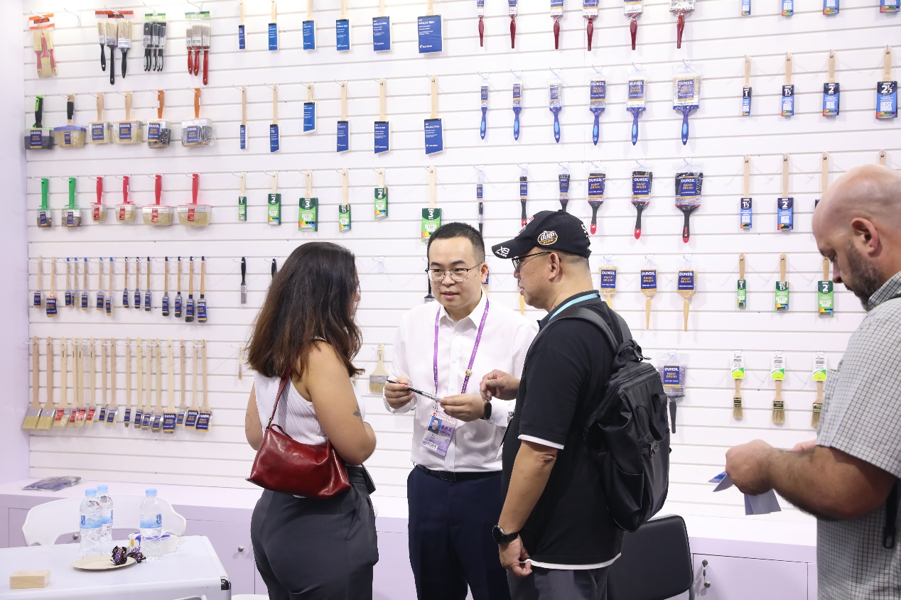在第一期廣交會上,浙江土畜包括下屬輕工、盛力公司共有工具、五金、新能源等在內(nèi)的29個展位。公司老牌出口拳頭產(chǎn)品的漆刷展位積極順應(yīng)綠色環(huán)保發(fā)展趨勢,帶來了用回收材料制成的油漆滾筒刷,并攜此產(chǎn)品參加了本屆廣交會新品發(fā)布活動。新能源展位作為新質(zhì)生產(chǎn)力產(chǎn)品開發(fā)前線,其光伏組件產(chǎn)品吸引了大量外商駐足和洽談。