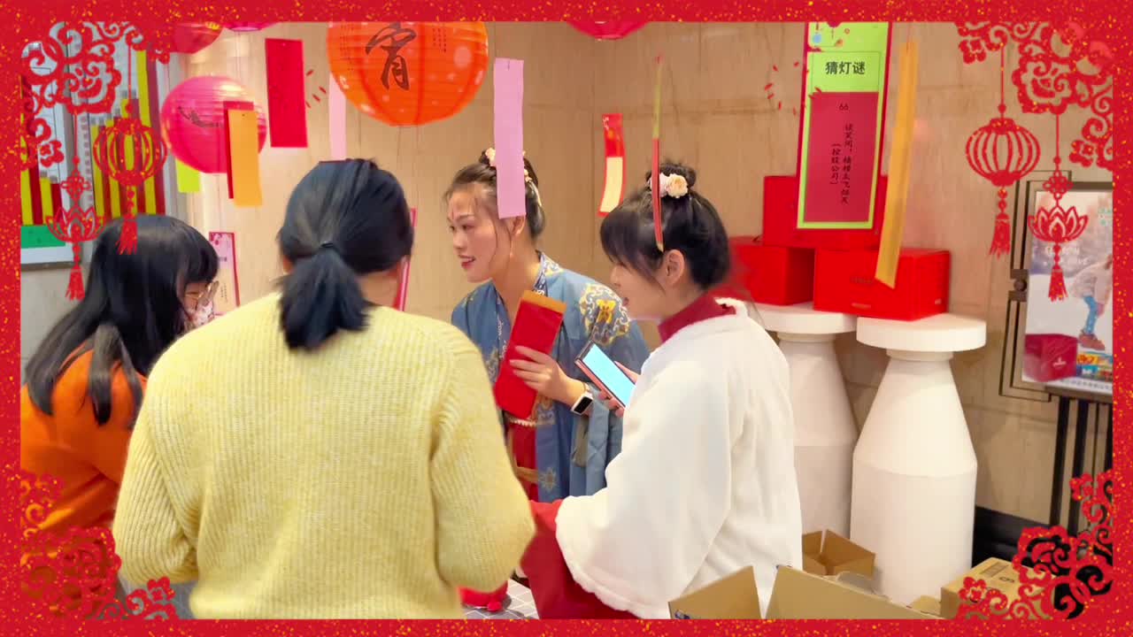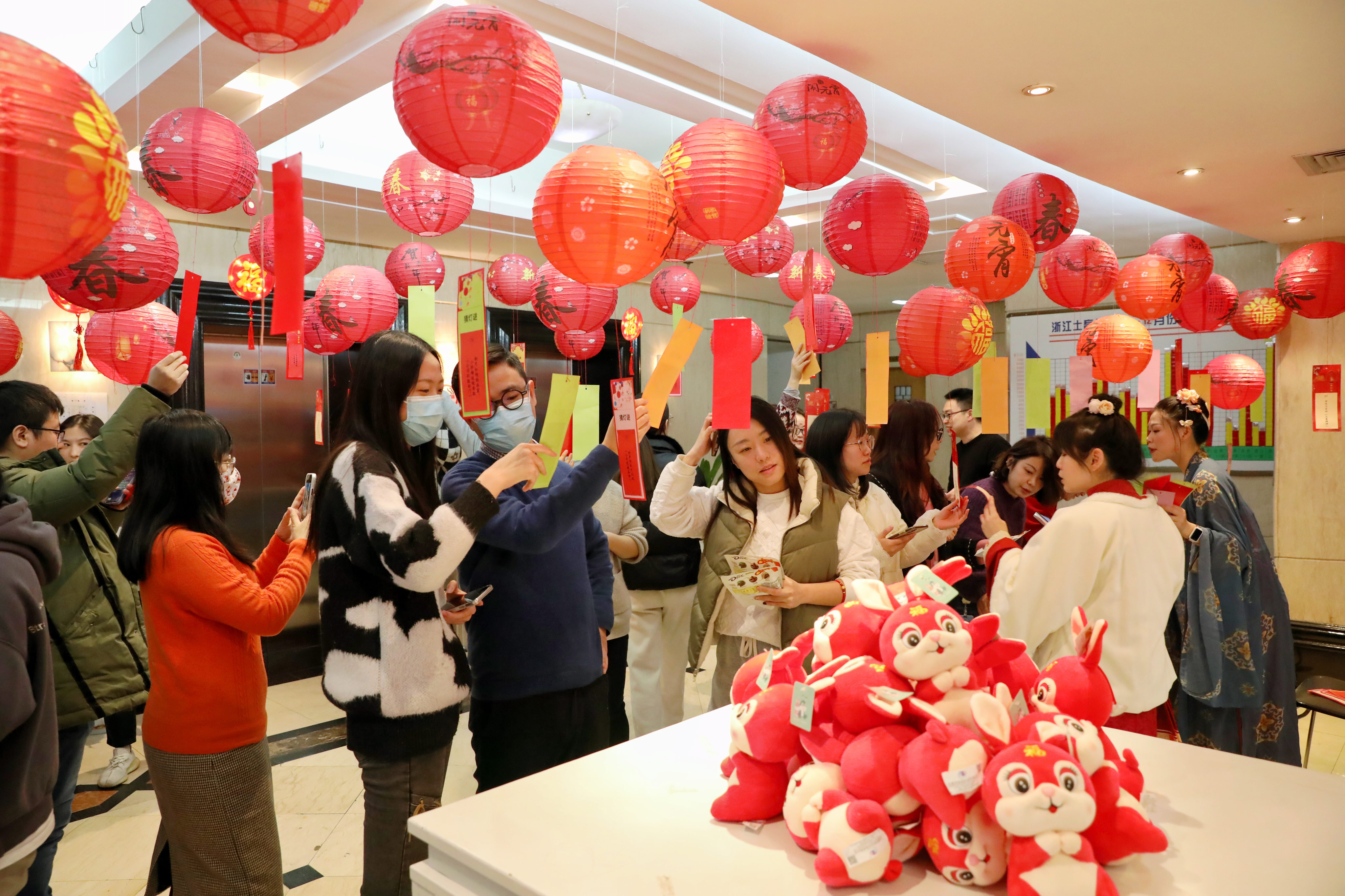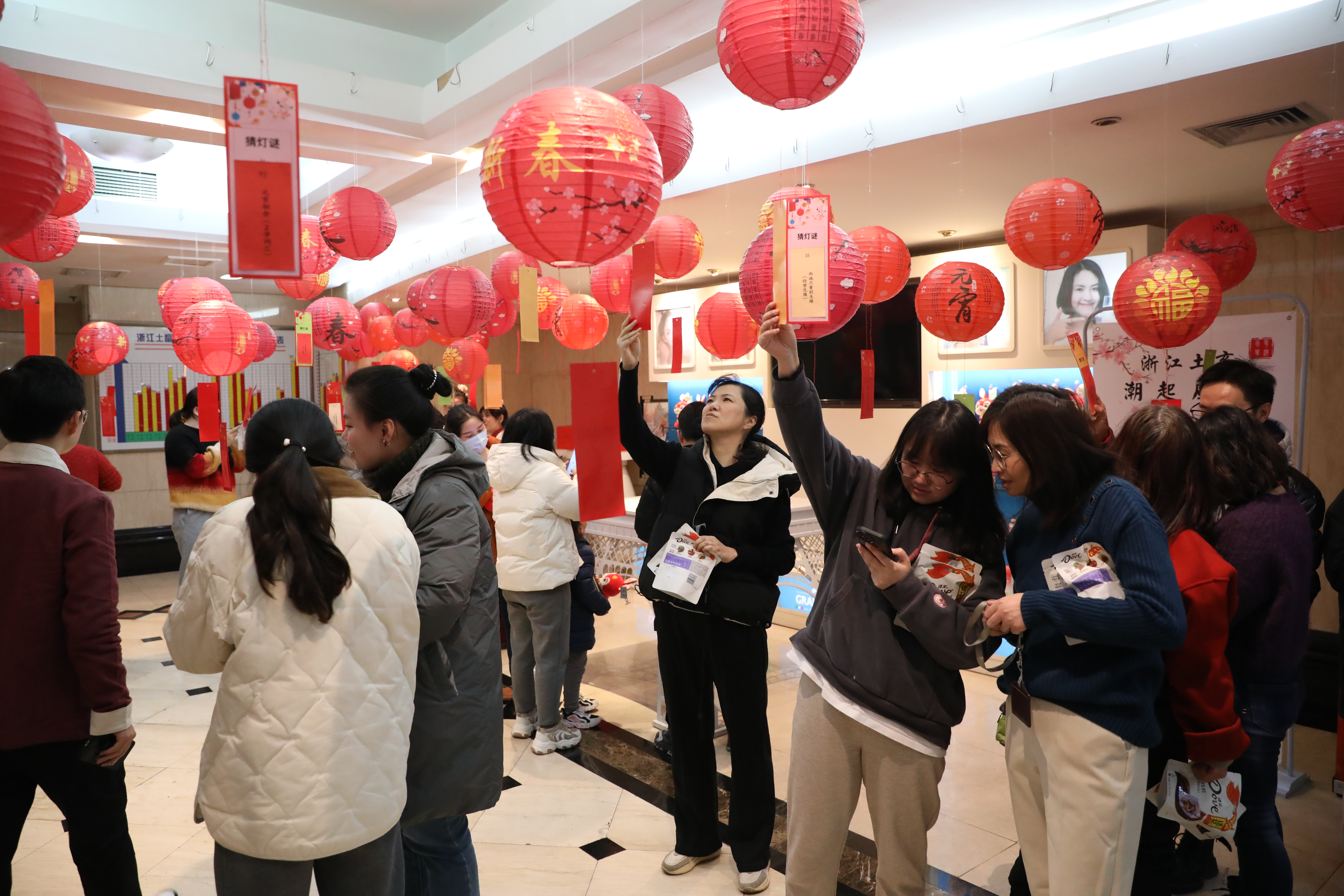 23日中午,浙江土畜工會組織開展元宵猜燈謎活動,公司三樓人頭攢動、熱鬧非凡,廳里錯落別致懸掛了一盞盞喜慶的紅燈籠,燈下都有五光十色的謎箋,吸引了許多員工駐足競猜,有的看著謎面低頭沉思,有的與同伴相互討論,領獎桌旁也是絡繹不絕。紅紅火火燈籠與熙熙攘攘的人群交相輝映,洋溢著濃濃的“土畜年味兒”。